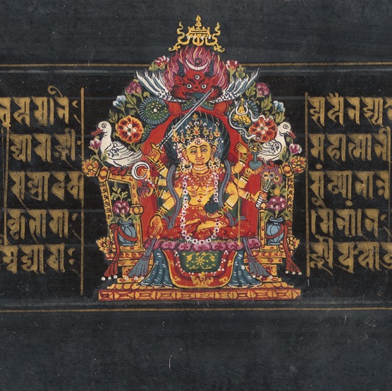 [๑๖] ยทา กปิลวสฺตุนิ มหานครวเร ราหุลภทฺระ กุมาโร มาตุะ กุกฺษิคโต ‘ภูตฺ ตทา โคปยา ศากฺยกนฺยยา อาตฺมานมฺ อคฺนิขทายํา ปฺรกฺษิปฺตะ ฯ ตตฺร ปทฺมินี ปฺราทุรฺภูตา ฯ ตทา ราหุลภทฺระ กุมาระ กุกฺษิคต อิมํา วิทฺยํา มนสฺยฺ อการฺษีตฺ ฯ อสฺยา วิทฺยายา อนุสฺมรณมาเตฺรณ โส ‘คฺนิสฺ ตสฺมินฺ กฺษเณ ศีตีภาวมฺ อุปคตะ ฯ ตโต โคปายาะ ศากฺยกนฺยายาะ ศรีรมฺ อคฺนินา น สฺปฤษฺฏมฺ อิติ ฯ